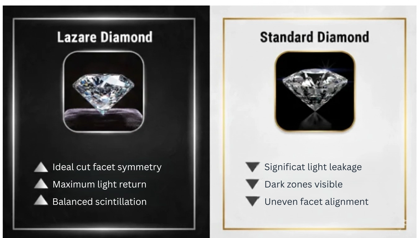 While brilliance levels vary between individual stones, controlled showroom tests consistently show measurable visual differences between Lazare diamonds and standard commercial cuts.